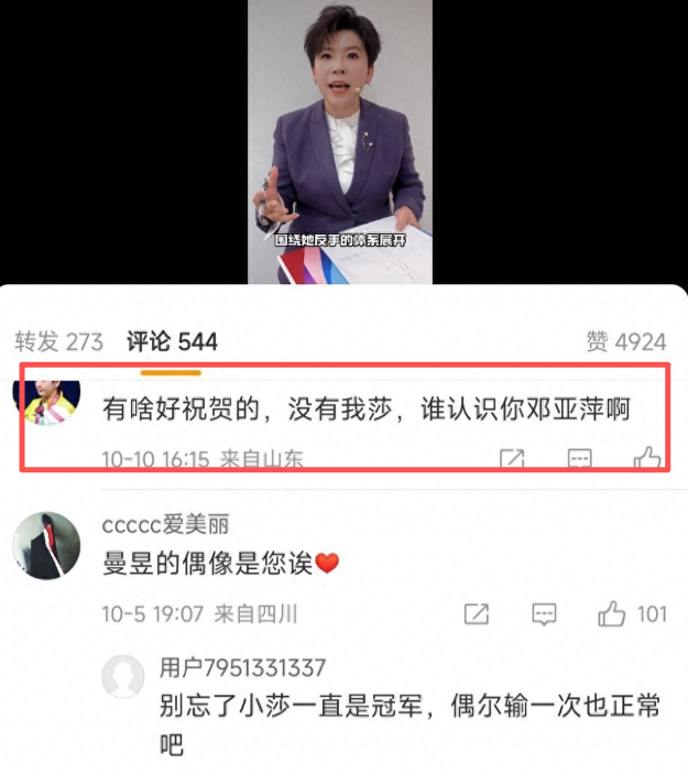作为奥运冠军,邓亚萍受邀在某平台解说了这场女单的巅峰对决。精彩的比赛,令邓亚萍情不自禁!解说过程中邓亚萍很是开心。她为两名国乒主力的表现感动!赛后社交媒体上,邓亚萍发布了一条祝贺王曼昱夺冠的视频,遗憾的是遭到黑粉的攻击。有黑粉表示,没有我莎,谁认识你邓亚萍?而令人意外的是,这条点评却赢得了不少球迷的点赞。